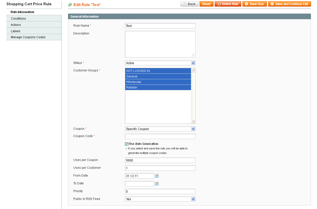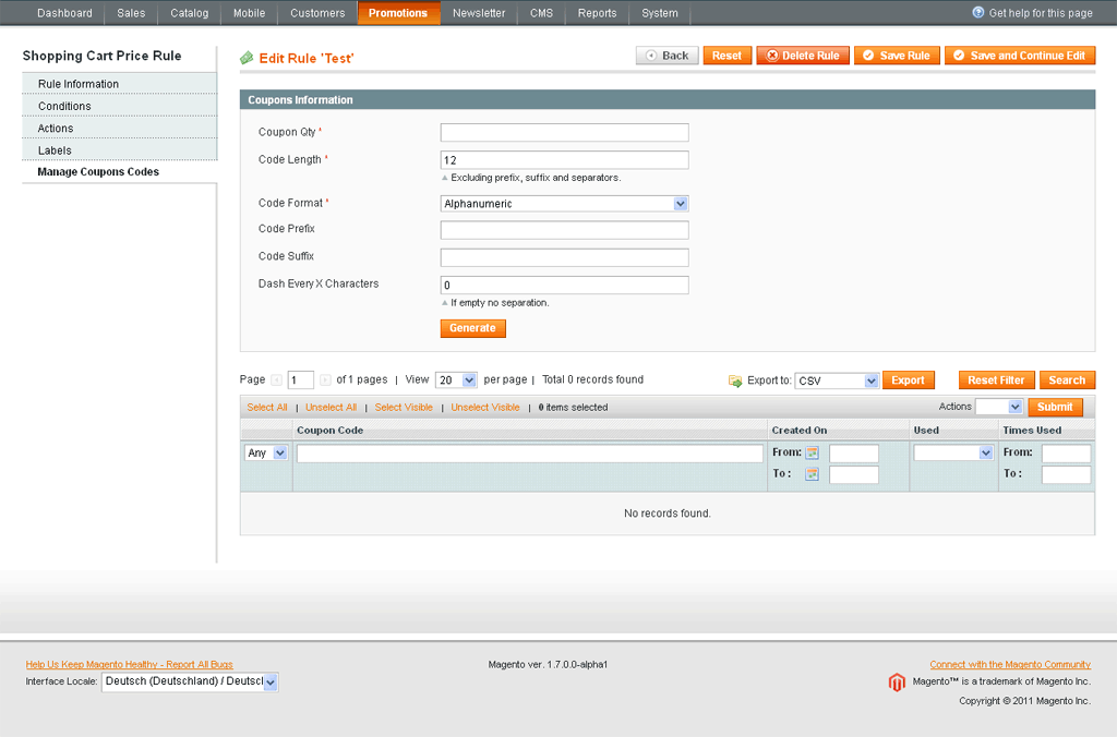 Doch das ändert sich nun. Mit Magento 1.7 wird eine Funktion zur automatischen Erstellung von Coupon-Codes für Preisregeln eingeführt, sprich: Magento kann nun auf Knopfdruck beliebig viele Gutschein-Codes nach dem Zufallsprinzip generieren. Die Preisregel muss dafür nur einmal angelegt werden.