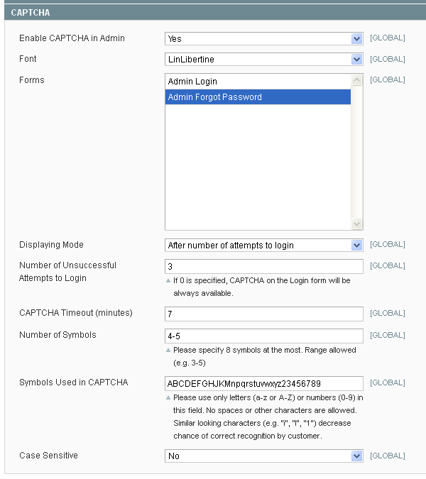 Wer die CAPTCHA-Funktion für das Magento-Backend aktivieren möchte, klickt sich zum Menüpunkt System > Configuration > Advanced > Admin > CAPTCHA durch. Nachdem die Option „Enable CAPTCHA in Admin“ auf „Yes“ gestellt wurde, kommen neue Einstellungsmöglichkeiten zum Vorschein (siehe Screenshot):